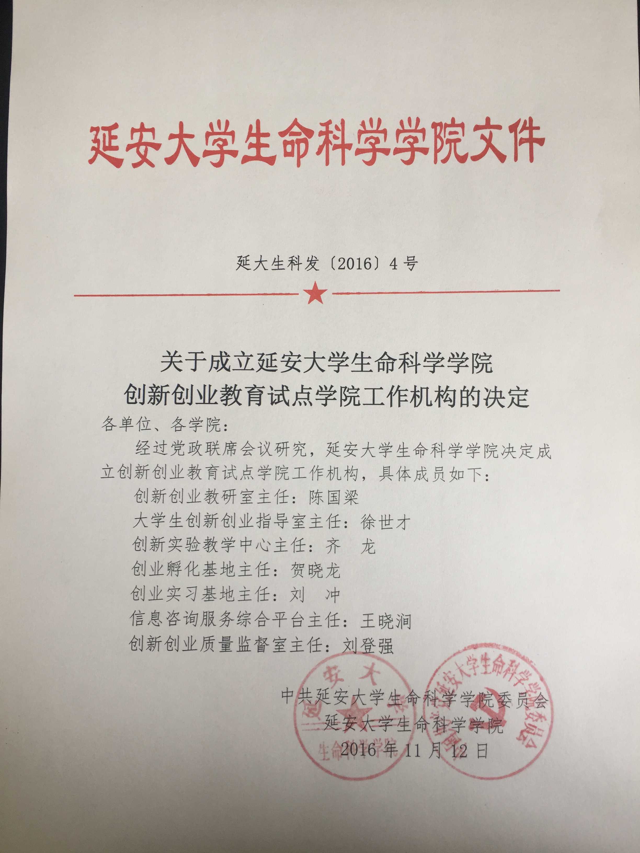 关于成立延安大学生命科学学院创新创业教育试点学院工作机构的决定
